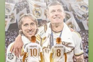 在社交媒体上,克罗斯晒出了自己和莫德里奇、姆巴佩和巴尔韦德的特效合成图,并写道:梦想和荣耀,欢迎和告别!